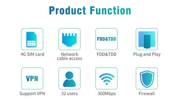 To je CAT 4 4G WiFi ruter brzina prijenosa do 300Mbps, 4G brzina do 150Mbps, TDD-LTE: 150Mbps DL / 50Mbps UL TD-SCDMA: 2.8Mbps DL / 2.2Mbps UL. Terminal može podržavati tri načina komunikacije: TDD FDD, WCDMA. Podržava pristup Internetu/PPPoE način rada, koristi 4G sim karticu, može se povezati na modemski rad kao Gateway način rada, opremljen sa 4 LAN interfejsa, može se povezati na druge uređaje istovremeno. Lako se povezuje i lako se nosi u ruci. Dijeljenje korisnika za 32 WiFi korisnika, samo umetnite SIM karticu, a zatim možete uživati u WiFi-u sa ovim prijenosnim 4G LTE ruterom.