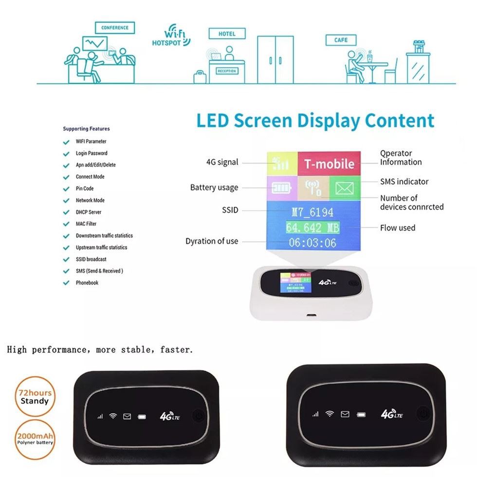 Podržava uslugu pristupa mobilnoj mreži 4G/3G/2G. Do 10 korisnika koji dijele 4G podatke putem dvokanalnog WIFI-ja u isto vrijeme. MDM9207 ima stabilnije performanse i manju snagu, vrijeme rada baterije do 10 sati, 48 sati u stanju pripravnosti. Podržan engleski/francuski/njemački/španski/portugalski/arapski jezik, RD tim i fabrički vlasnici pružaju vam punu tehničku podršku i OEM uslugu.